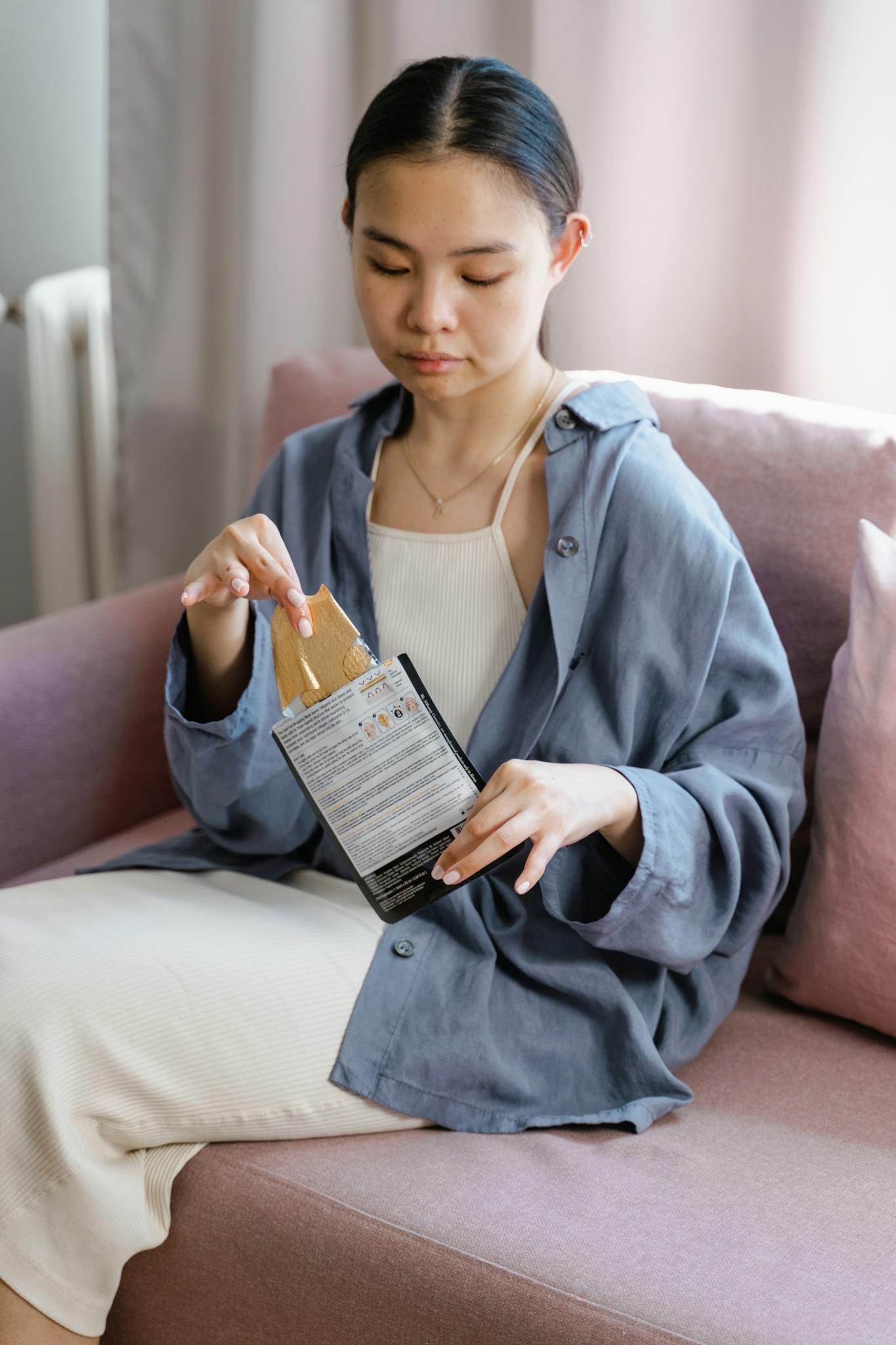 Asian woman sitting on a couch unpacking a skincare product with focus and care.